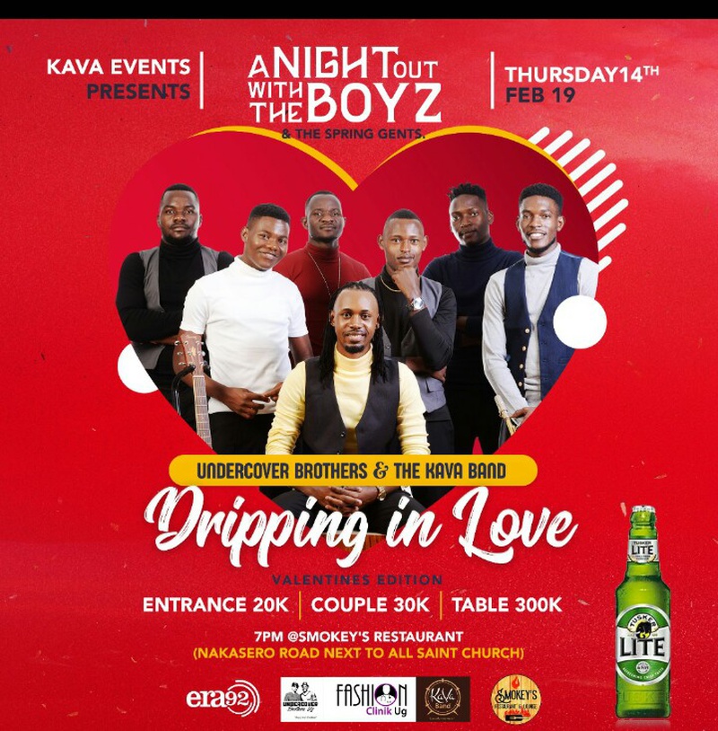 Kava events presents ''Dripping in love'' a night out with the boyz and the spring gents alongside undercover brothers and the kava band. Date: 14th Feb Time: 7PM Venue: Smokey's restaurant Fee: UGX 20,000 Couple- UGX 30,000 Table-300,000