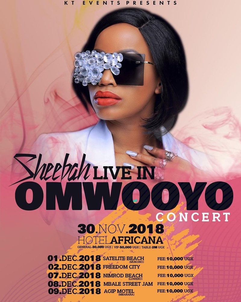 Come support the best female ugandan award winner, Sheebah live in Omwooyo concert on 30th November at Hotel Africana. General: 30k VIP: 50k Table: 2m